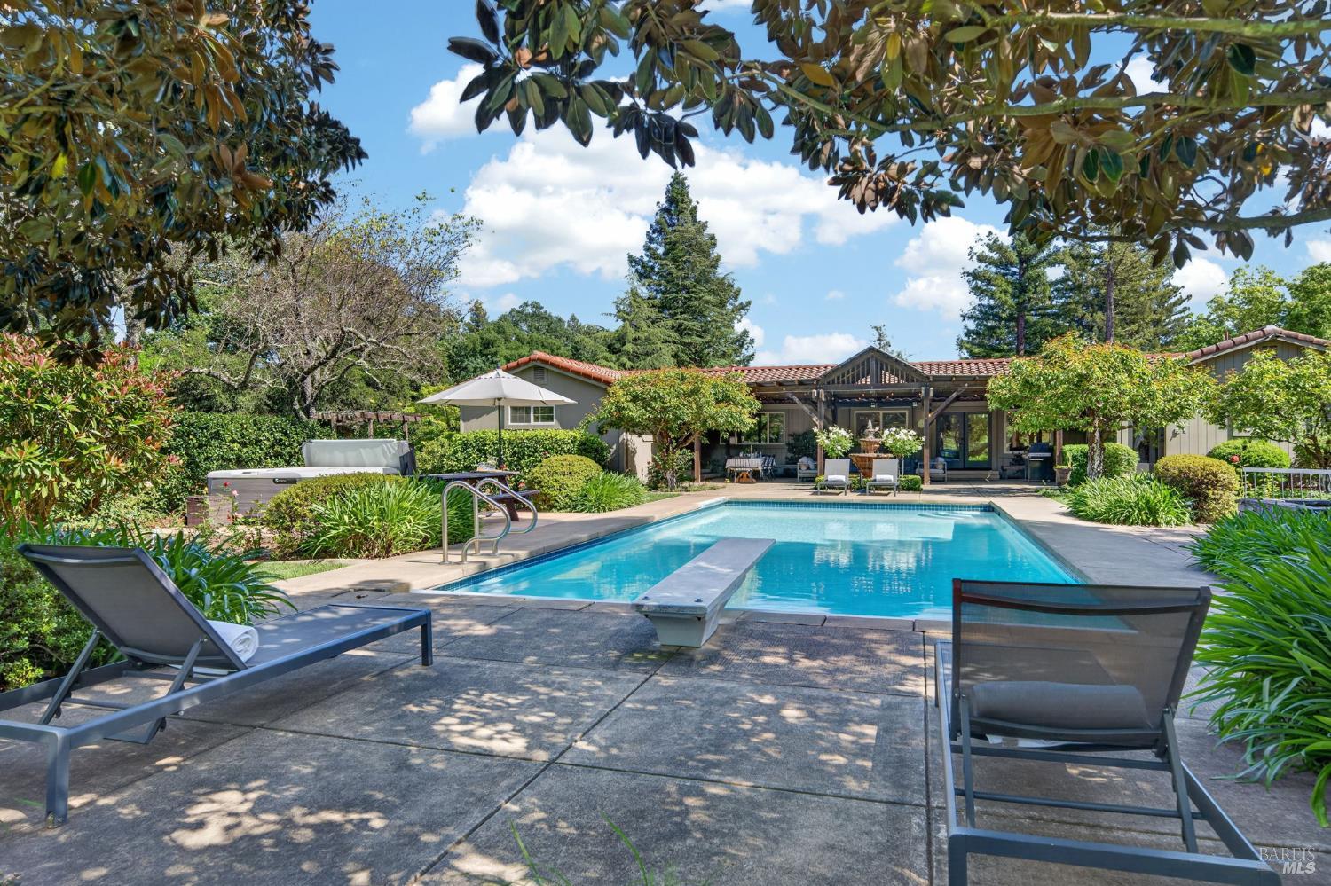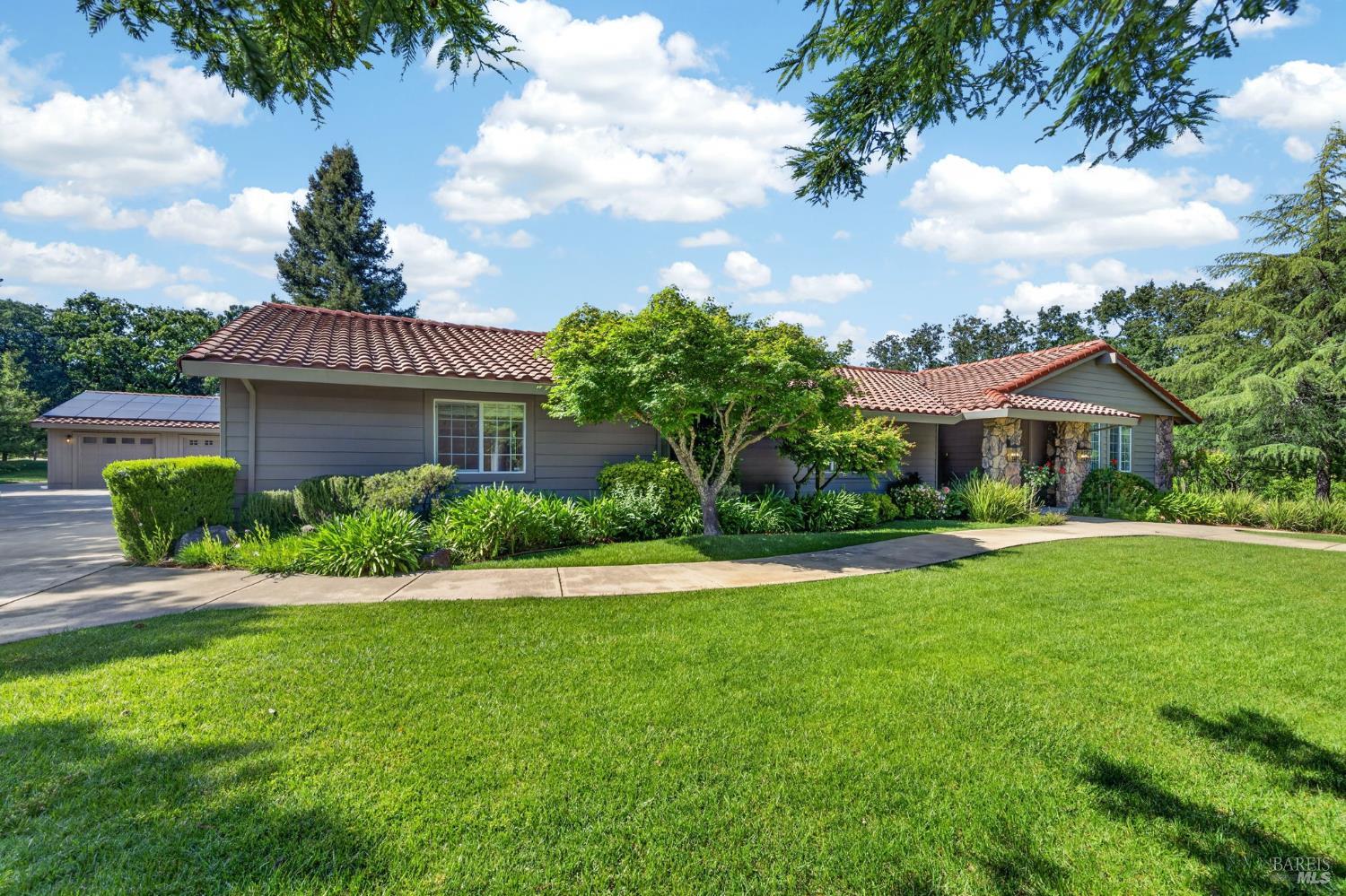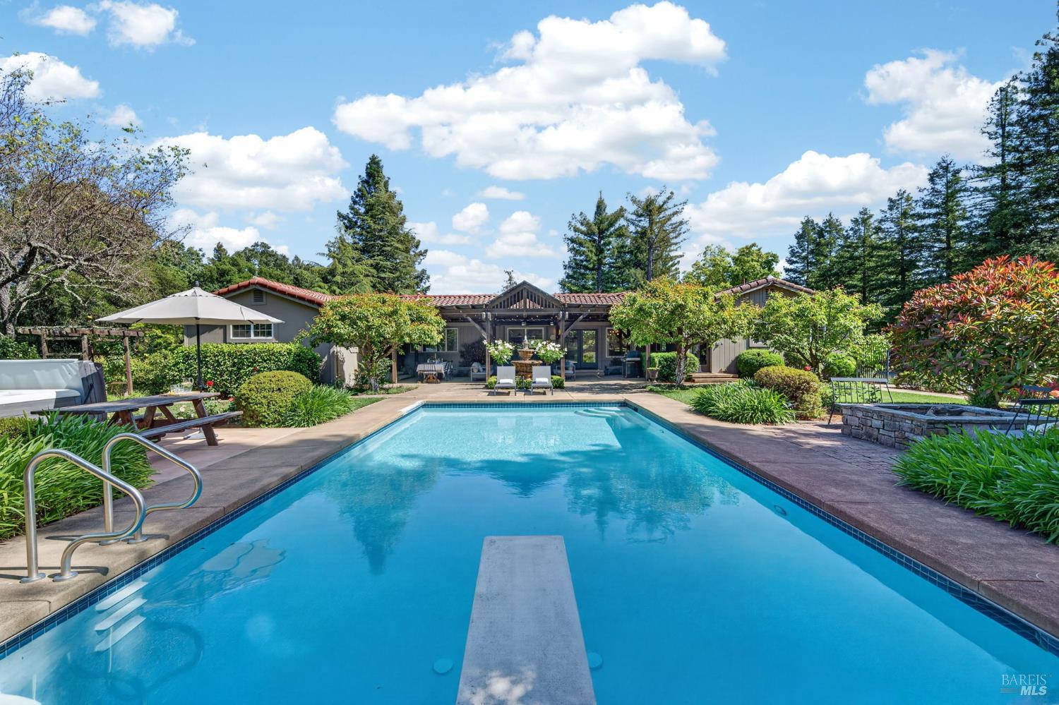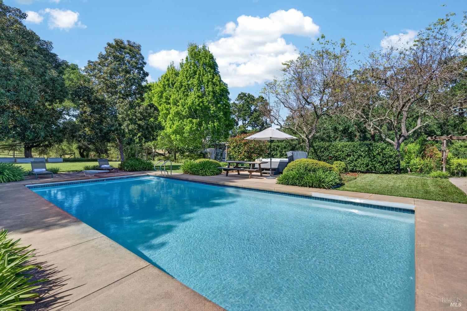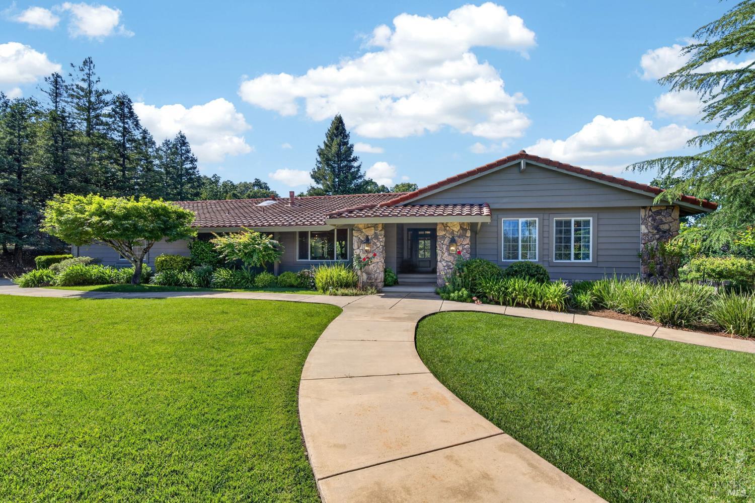 Welcome to Healdsburg! A sprawling single-level home set on 1.4 acres in Healdsburg's coveted Vintage Hills neighborhood. Perfectly marrying the charm of country living with the convenience of city services, all tucked away on a peaceful lane that embodies the best of Wine Country living. This property is as practical as it is beautiful, offering exceptional energy efficiency with an owned solar system and a brand-new 40-gallon-per-minute well, keeping utility costs impressively low. Step inside and discover warm hardwood floors that lead you through the home's thoughtful layout. At its heart, you'll find the formal living room with a cozy gas fireplace and chef's kitchen ideal for entertaining. All 5 bedrooms are privately situated on the east side of the home, with the primary bedroom in the rear and opening to the backyard. The family room, rec room, office, and laundry are on the west wing of the home, also opening to the backyard, creating a harmonious indoor-outdoor flow. Step outside to your resort-like grounds. Gather with family and friends on your covered patio with cooling misters for hot days and ceiling heaters for chilly evenings. Spend your days lounging by the pool, and nights stargazing in the hot tub or circling around the fire pit. A ton of room for recreation with a huge lawn & a driveway spacious enough to set up a pickleball court. The east side of the property borders a seasonal creek and offers the beginning of an abundant homestead, with a chicken coop and an orchard of over 50 fruit trees. Additionally, there is a detached 4-car garage with an overhead door leading to the backyard. All of this and just a short 7-minute drive to the Healdsburg Plaza and 1 hour to the Golden Gate. This is an ideal property for full-time residences or a Wine Country retreat.