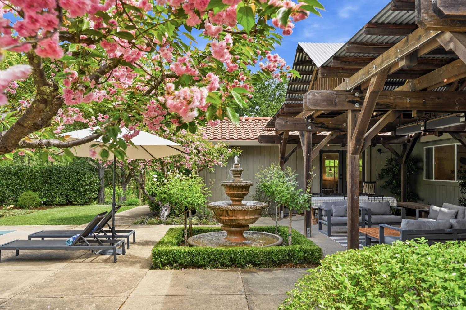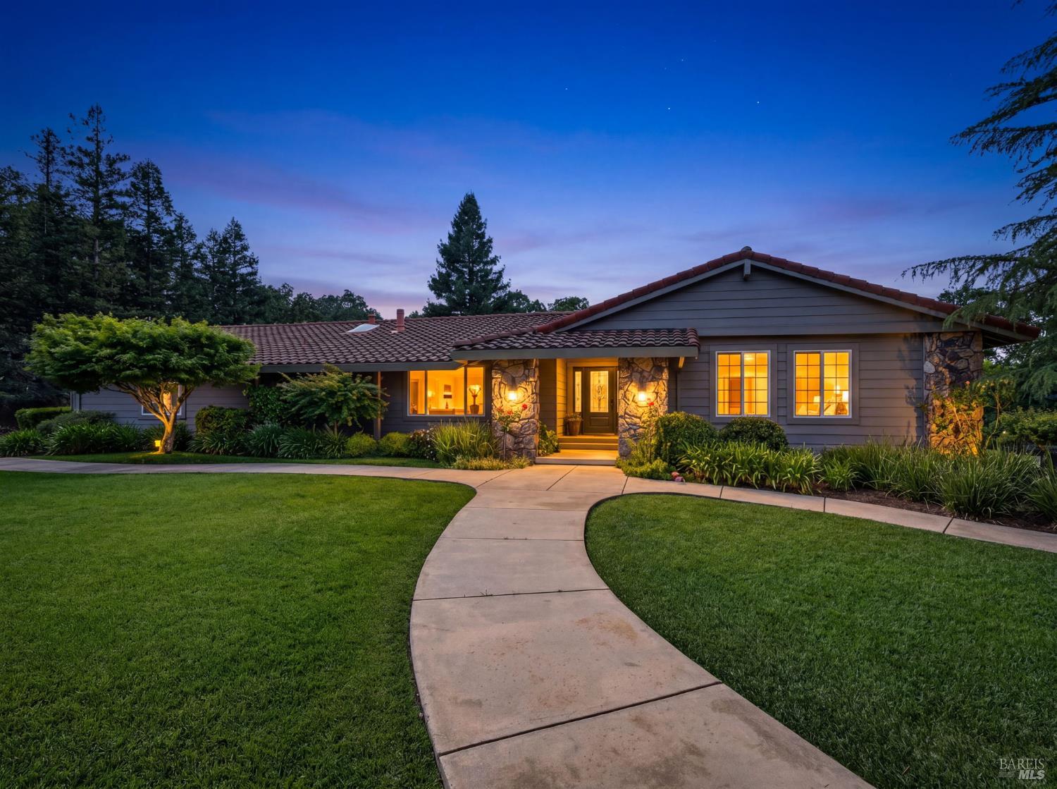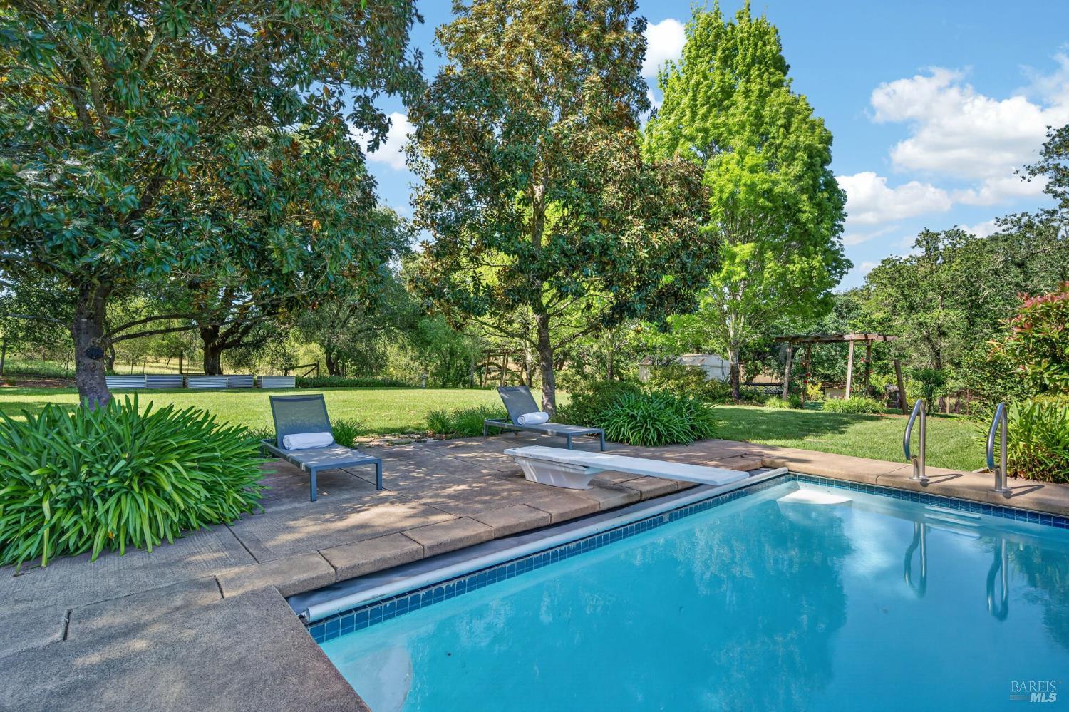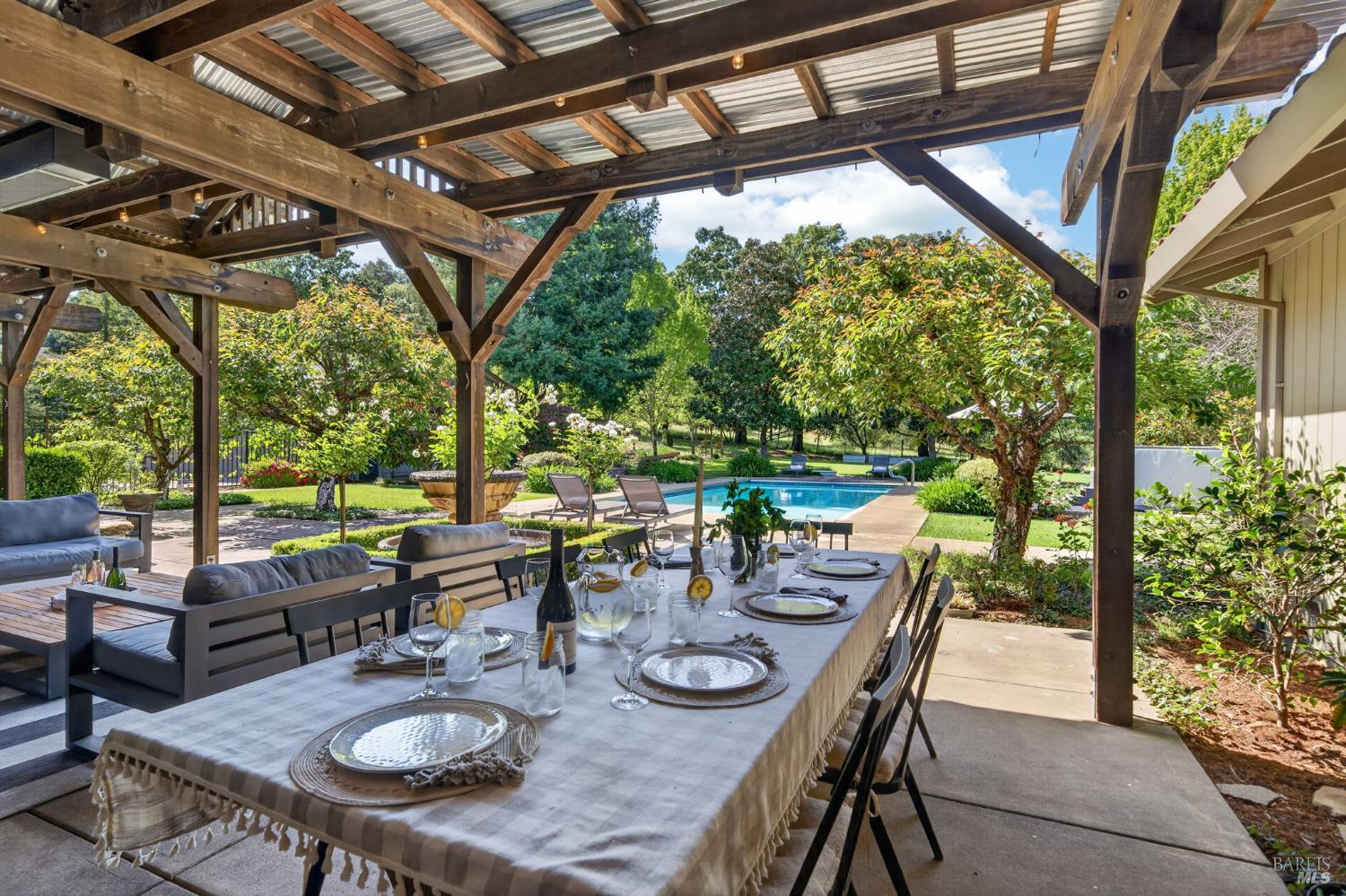 Welcome to Healdsburg! A sprawling single-level home set on 1.4 acres in Healdsburg's coveted Vintage Hills neighborhood. Perfectly marrying the charm of country living with the convenience of city services, all tucked away on a peaceful lane that embodies the best of Wine Country living. This property is as practical as it is beautiful, offering exceptional energy efficiency with an owned solar system and a brand-new 40-gallon-per-minute well, keeping utility costs impressively low. Step inside and discover warm hardwood floors that lead you through the home's thoughtful layout. At its heart, you'll find the formal living room with a cozy gas fireplace and chef's kitchen ideal for entertaining. All 5 bedrooms are privately situated on the east side of the home, with the primary bedroom in the rear and opening to the backyard. The family room, rec room, office, and laundry are on the west wing of the home, also opening to the backyard, creating a harmonious indoor-outdoor flow. Step outside to your resort-like grounds. Gather with family and friends on your covered patio with cooling misters for hot days and ceiling heaters for chilly evenings. Spend your days lounging by the pool, and nights stargazing in the hot tub or circling around the fire pit. A ton of room for recreation with a huge lawn & a driveway spacious enough to set up a pickleball court. The east side of the property borders a seasonal creek and offers the beginning of an abundant homestead, with a chicken coop and an orchard of over 50 fruit trees. Additionally, there is a detached 4-car garage with an overhead door leading to the backyard. All of this and just a short 7-minute drive to the Healdsburg Plaza and 1 hour to the Golden Gate. This is an ideal property for full-time residences or a Wine Country retreat.