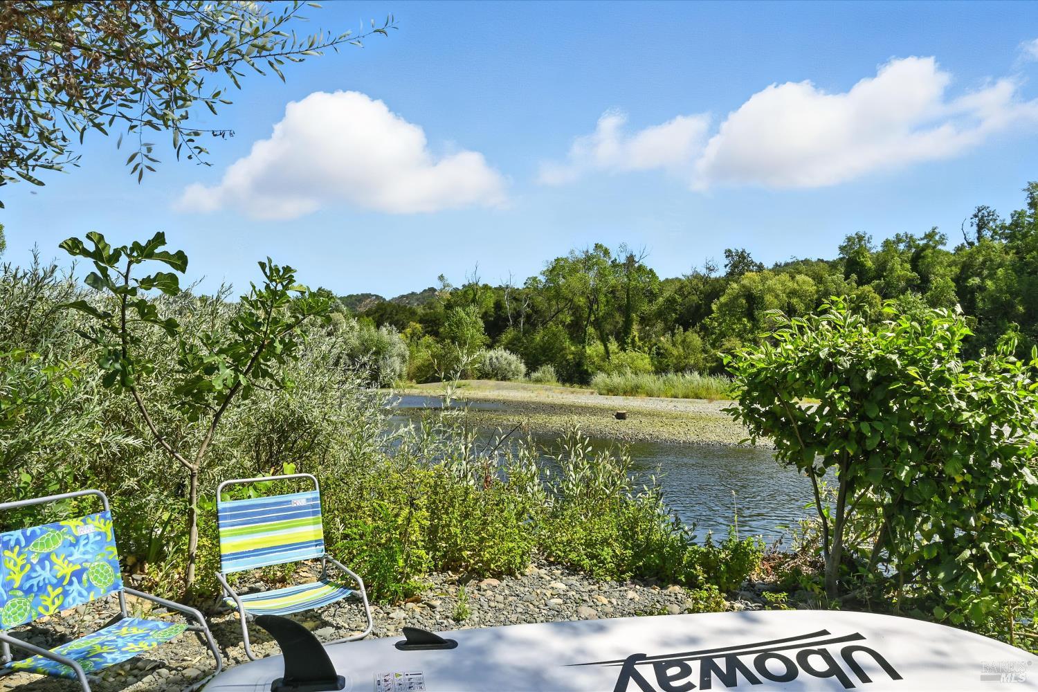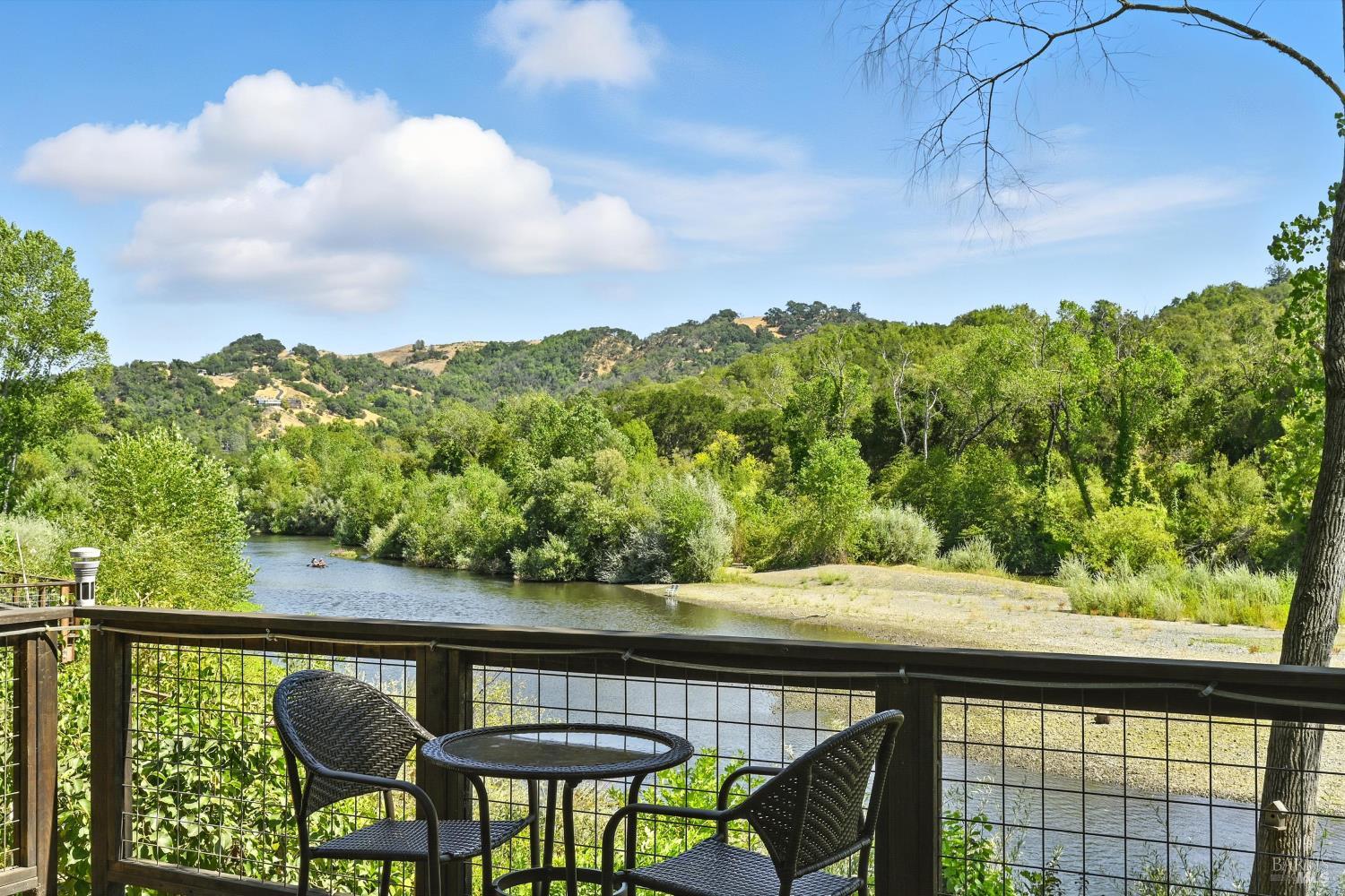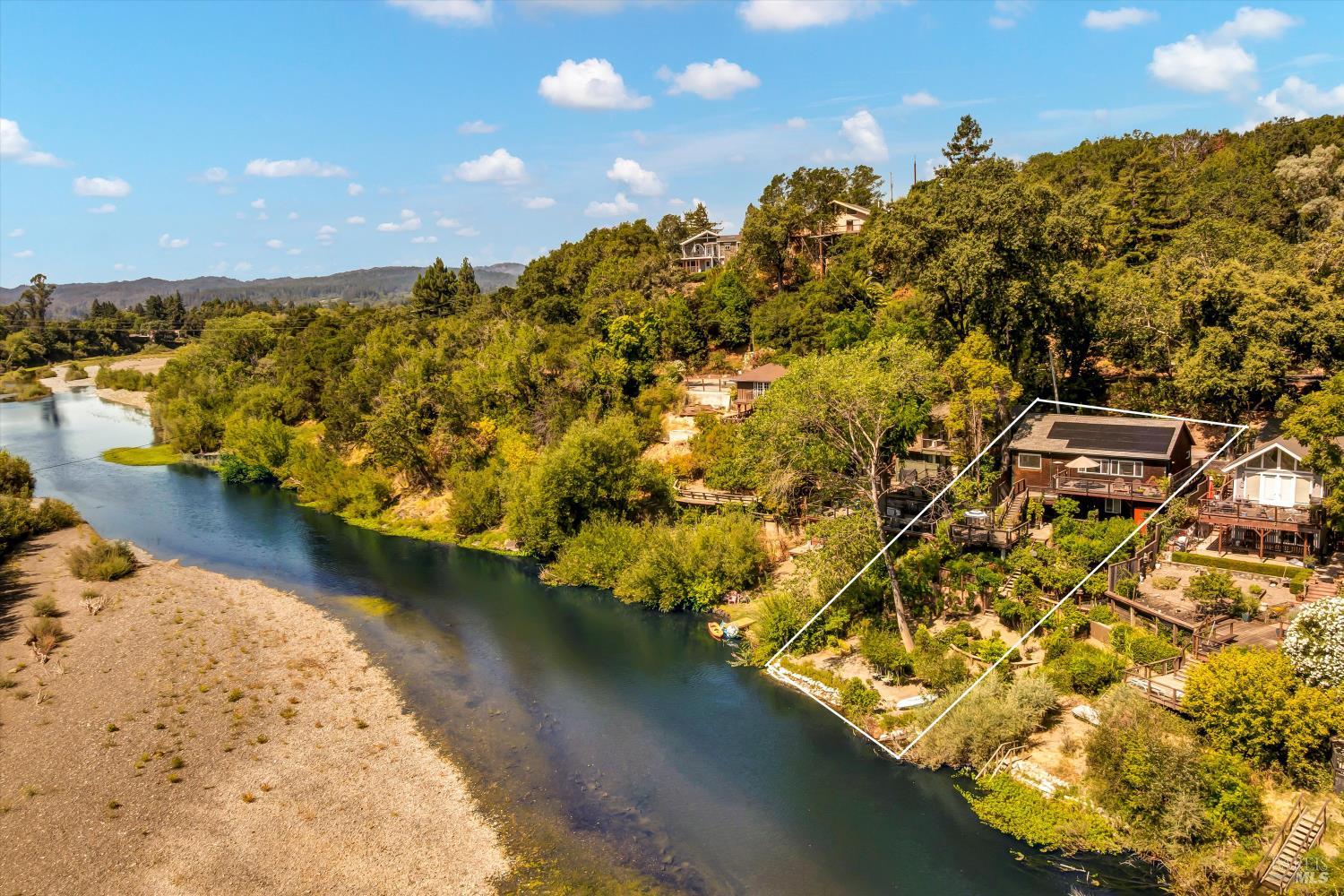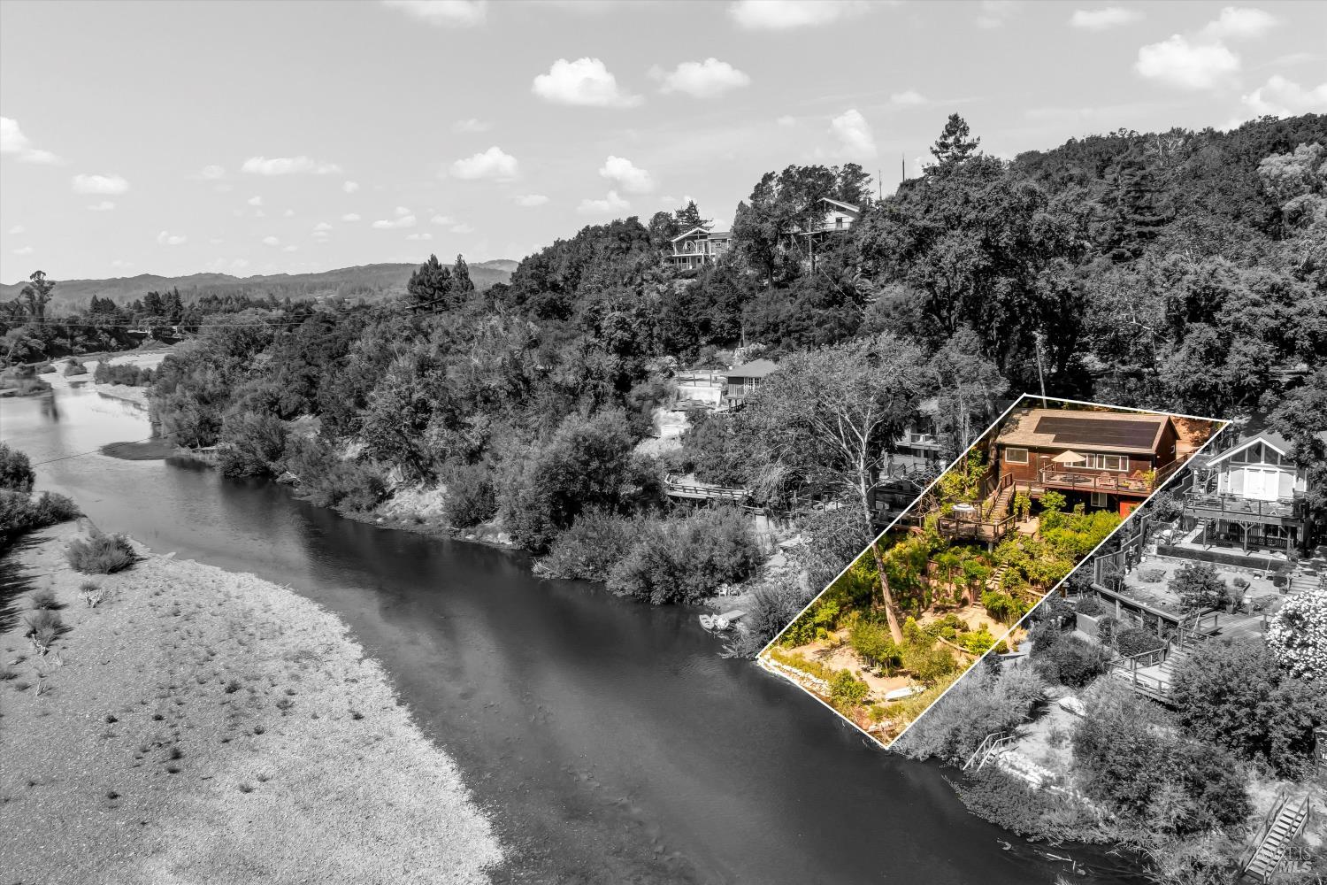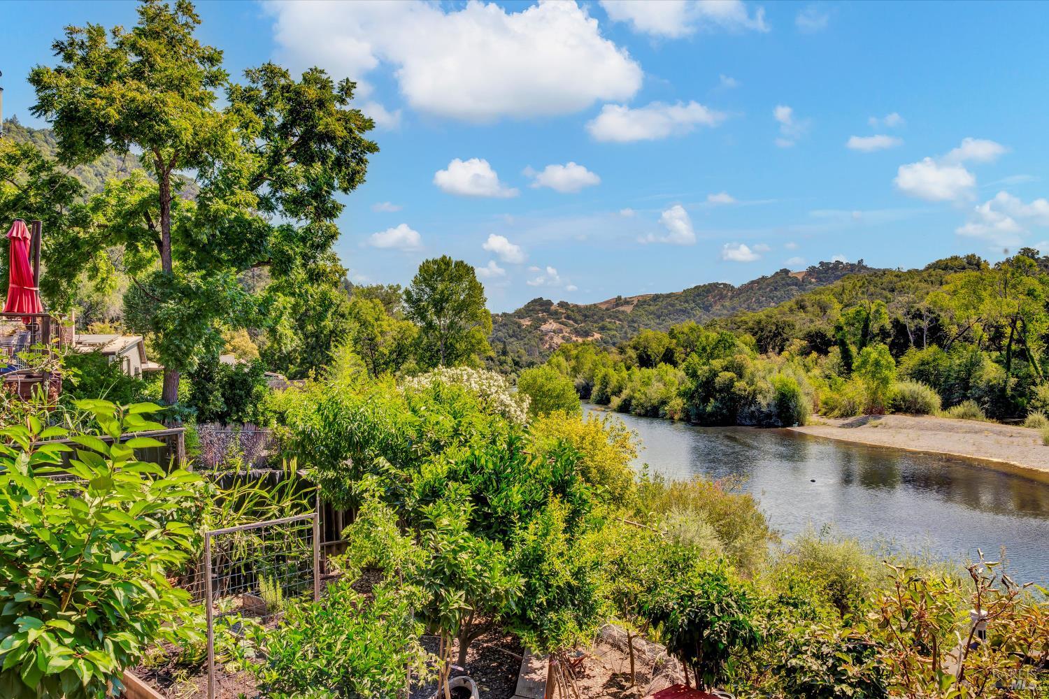 A mesmerizing riverfront oasis in desirable Healdsburg! This completely updated and remodeled 2BD/1BA home comes with unparalleled views & private access to Healdsburg's Russian River. Be welcomed by an open floor plan, high vaulted ceilings & hardwood floors throughout. Large dual-pane windows bring the outside in, highlighting the expansive kitchen with granite counters, stainless steel appliances & plenty of storage. Excellent all-day sun on multiple-tiered decks off the back of the home to enjoy the Wine Country lifestyle! This property is a gardener's dream. Walk through a tiered food forest with exotic fruit trees, flowers, and vegetable gardens. Superb river access for swimming, fishing, and kayaking. Additionally, on the lower level, the home has a full 900sf basement /workshop and a separate space for guests. Located on a quiet lane off the main road, parking for 3-4 cars, and a short distance from the downtown plaza. Powered by an owned solar system & price includes a restful sauna and Murphy bed in second bedroom. This is a rare find along the Russian River in sought-after Healdsburg, and an ideal place to live your life in Sonoma County's bucolic Wine Country.