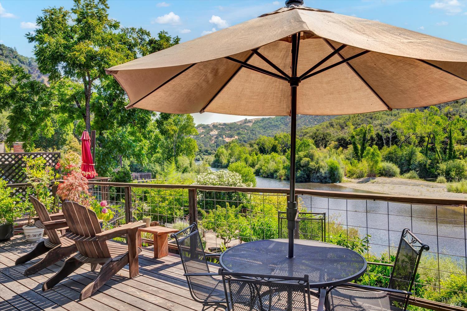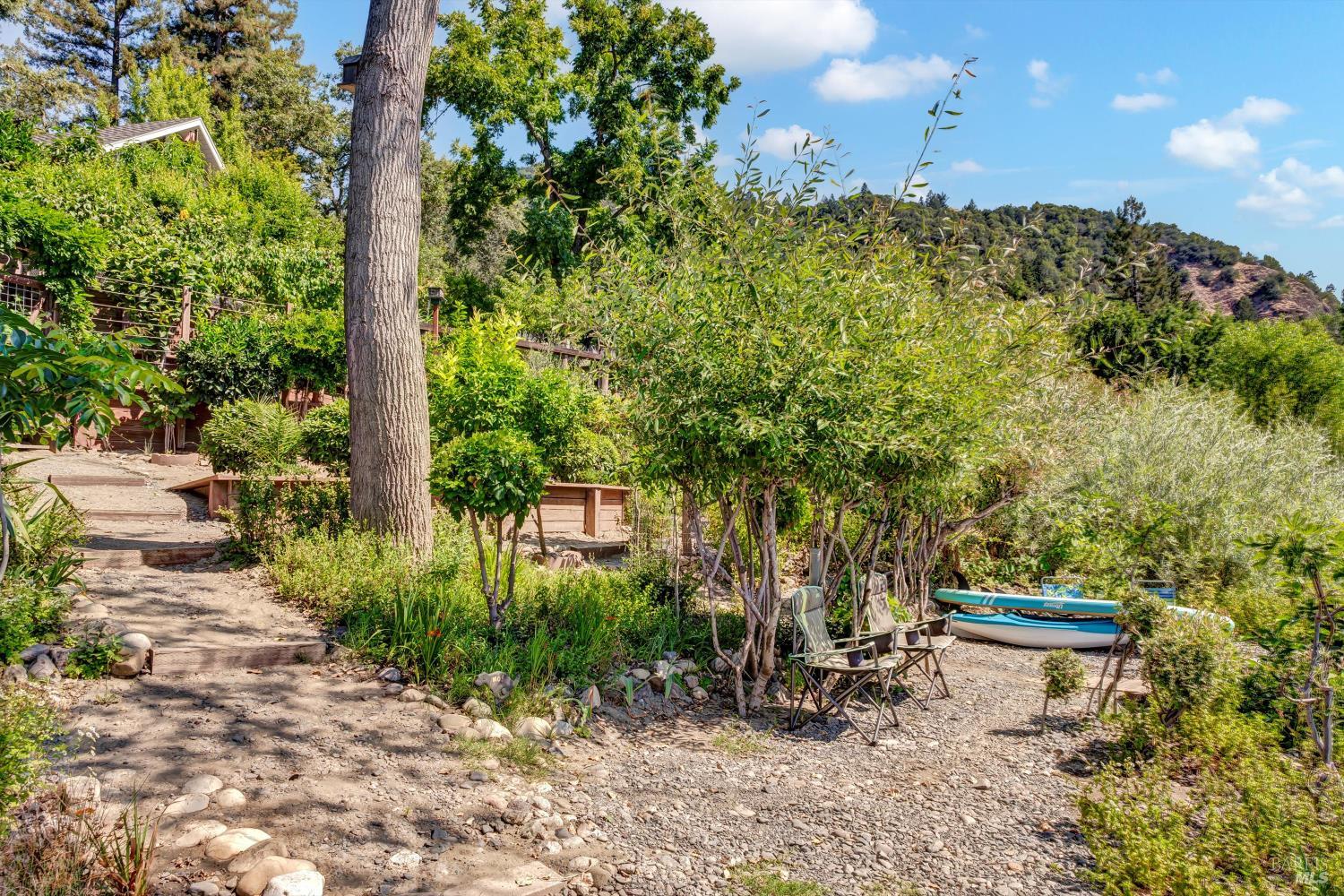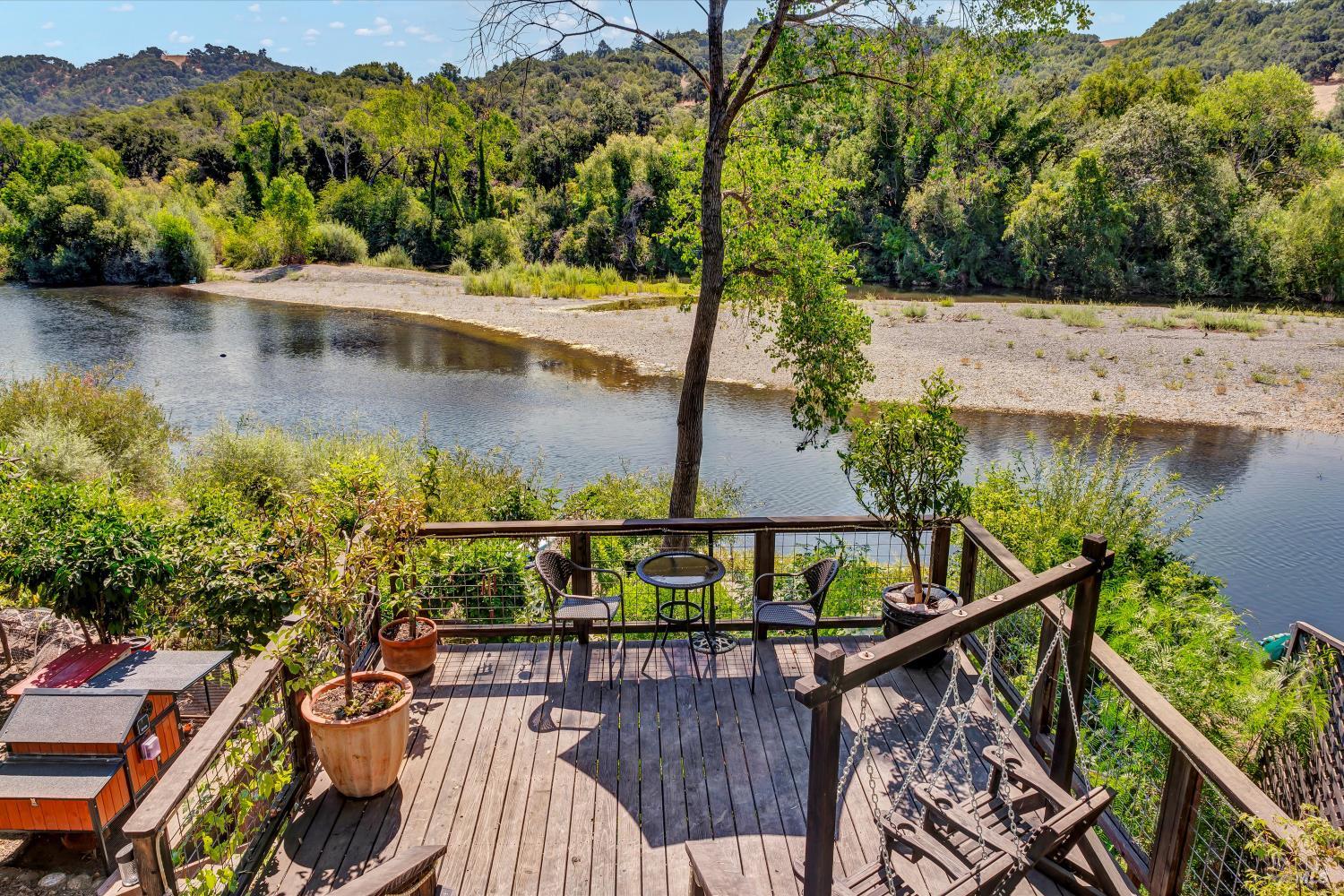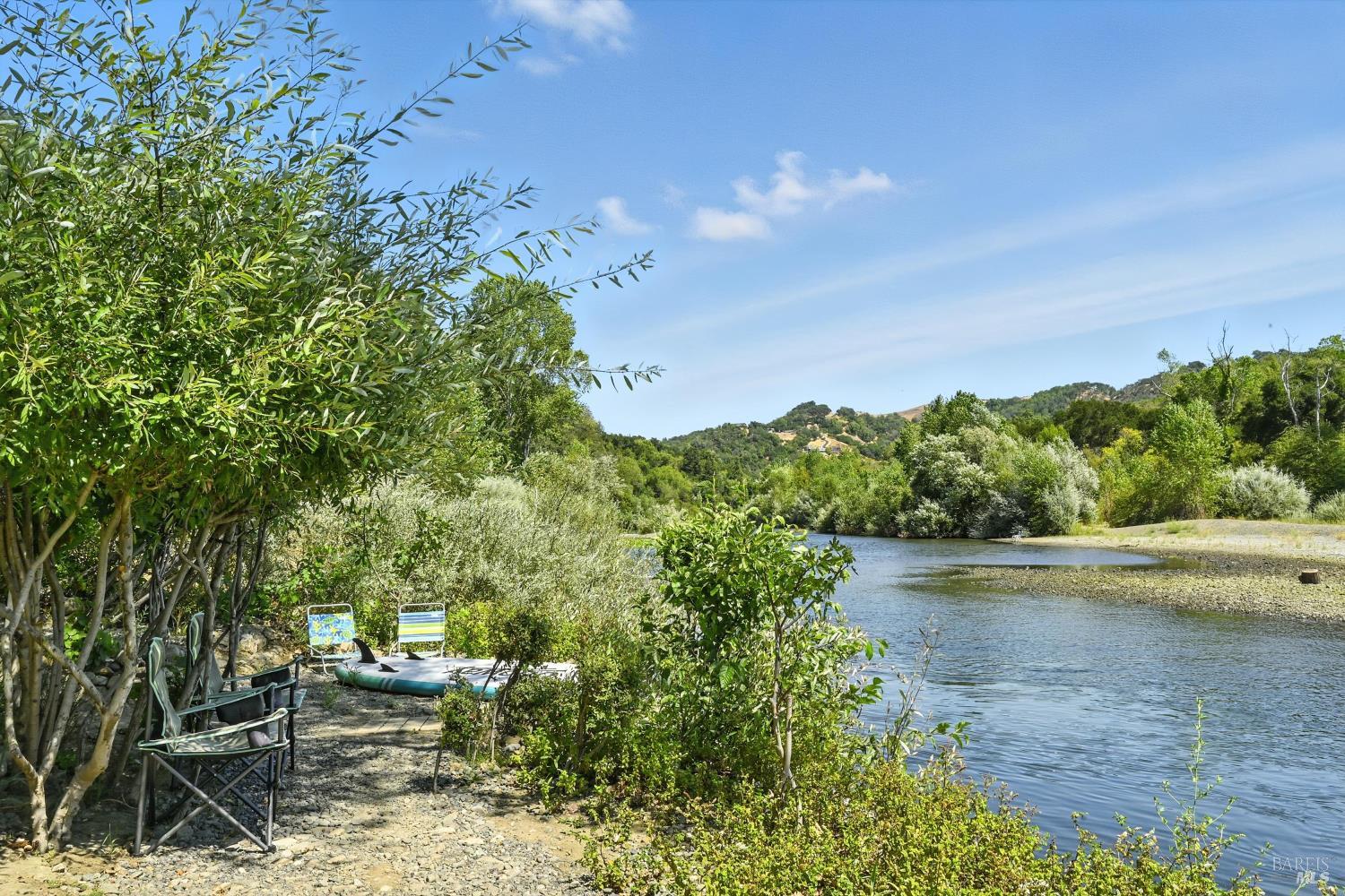 A mesmerizing riverfront oasis in desirable Healdsburg! This completely updated and remodeled 2BD/1BA home comes with unparalleled views & private access to Healdsburg's Russian River. Be welcomed by an open floor plan, high vaulted ceilings & hardwood floors throughout. Large dual-pane windows bring the outside in, highlighting the expansive kitchen with granite counters, stainless steel appliances & plenty of storage. Excellent all-day sun on multiple-tiered decks off the back of the home to enjoy the Wine Country lifestyle! This property is a gardener's dream. Walk through a tiered food forest with exotic fruit trees, flowers, and vegetable gardens. Superb river access for swimming, fishing, and kayaking. Additionally, on the lower level, the home has a full 900sf basement /workshop and a separate space for guests. Located on a quiet lane off the main road, parking for 3-4 cars, and a short distance from the downtown plaza. Powered by an owned solar system & price includes a restful sauna and Murphy bed in second bedroom. This is a rare find along the Russian River in sought-after Healdsburg, and an ideal place to live your life in Sonoma County's bucolic Wine Country.