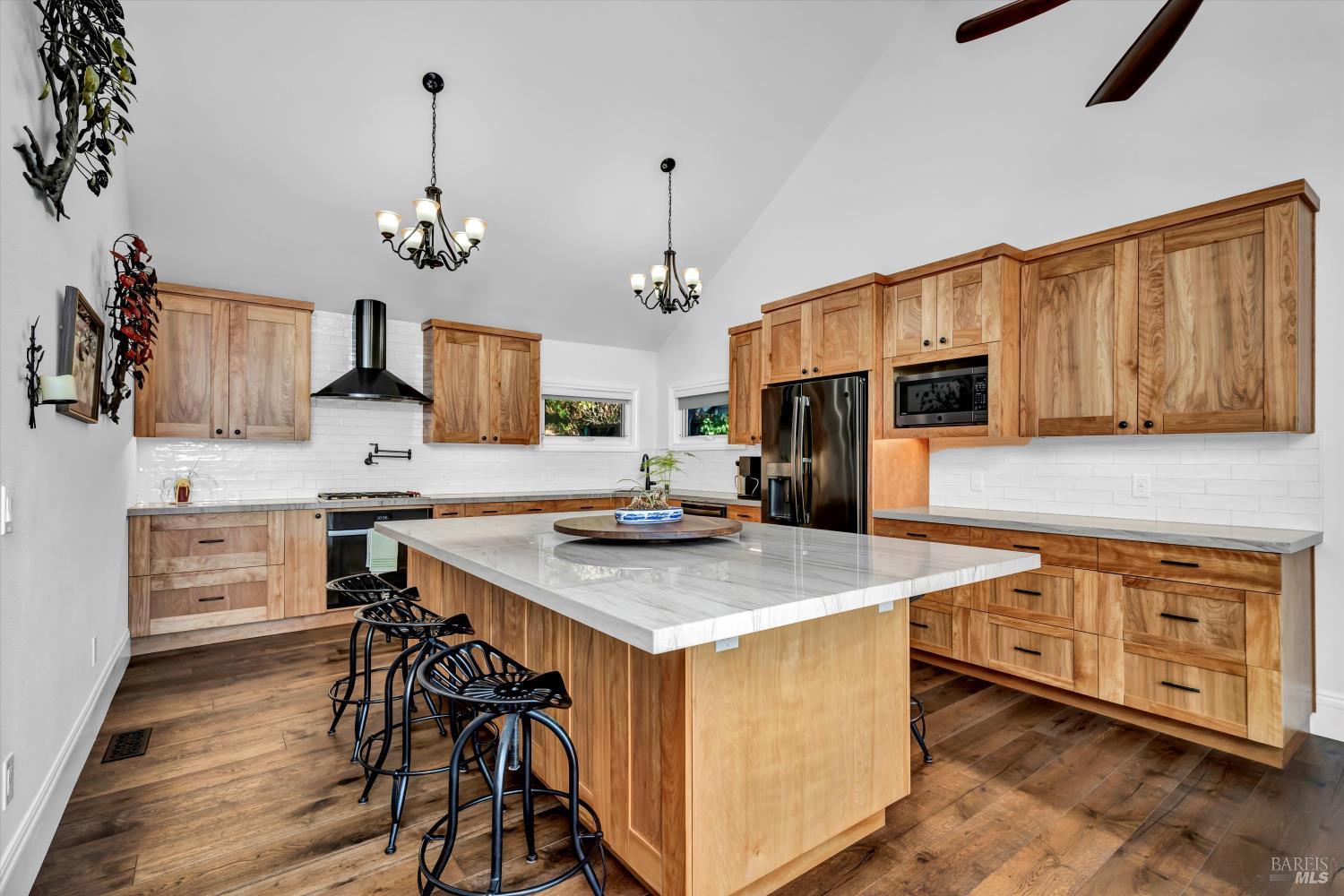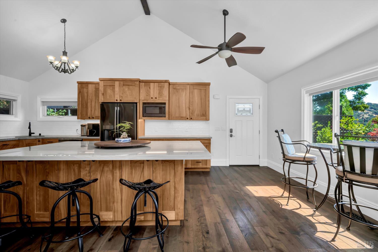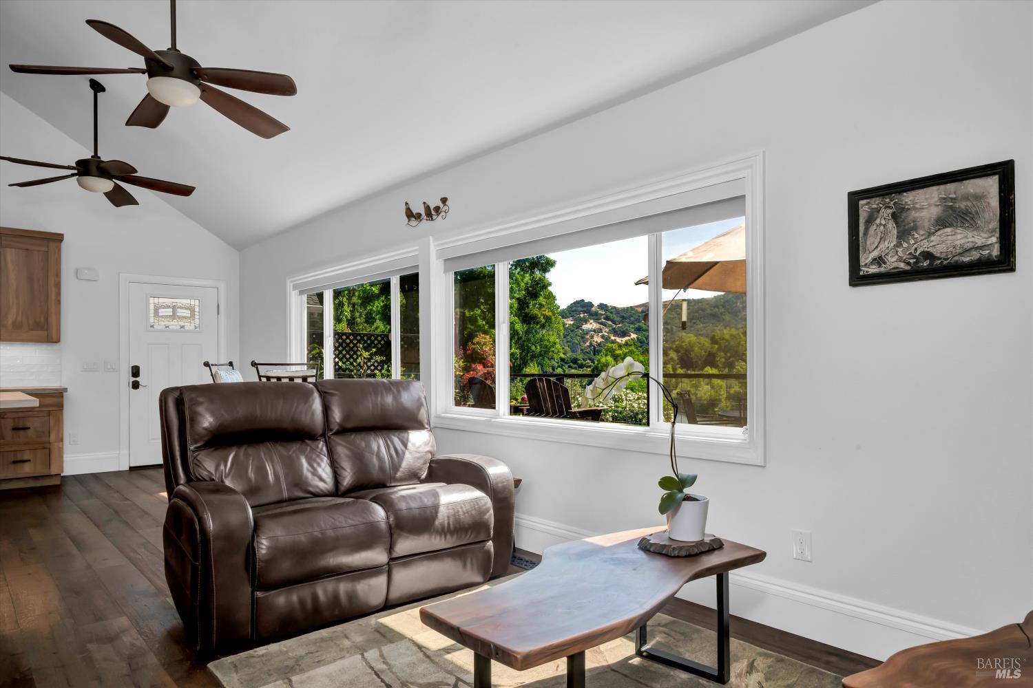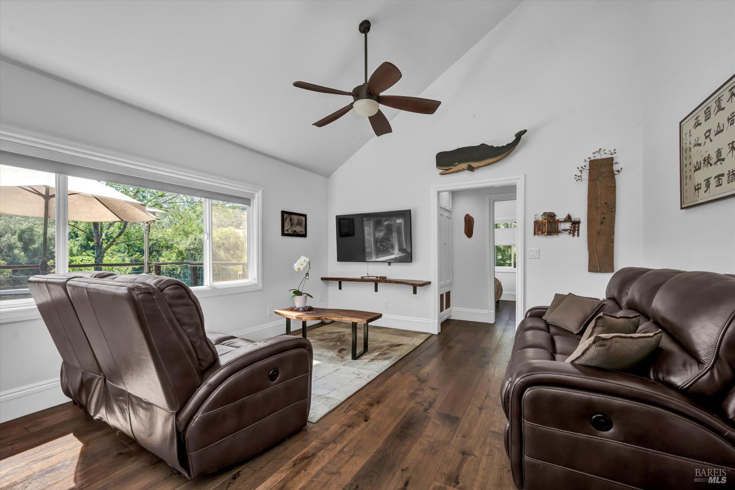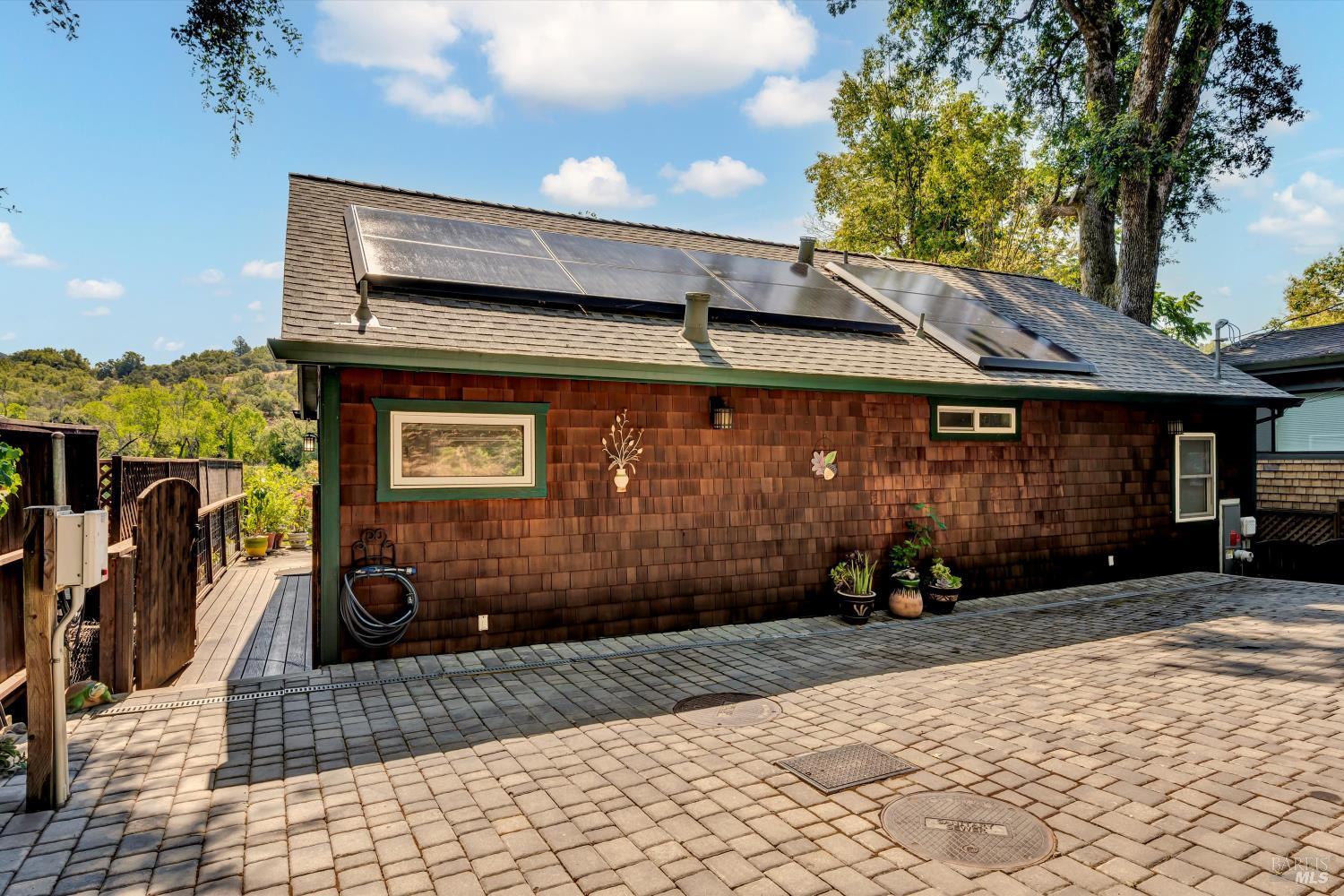 A mesmerizing riverfront oasis in desirable Healdsburg! This completely updated and remodeled 2BD/1BA home comes with unparalleled views & private access to Healdsburg's Russian River. Be welcomed by an open floor plan, high vaulted ceilings & hardwood floors throughout. Large dual-pane windows bring the outside in, highlighting the expansive kitchen with granite counters, stainless steel appliances & plenty of storage. Excellent all-day sun on multiple-tiered decks off the back of the home to enjoy the Wine Country lifestyle! This property is a gardener's dream. Walk through a tiered food forest with exotic fruit trees, flowers, and vegetable gardens. Superb river access for swimming, fishing, and kayaking. Additionally, on the lower level, the home has a full 900sf basement /workshop and a separate space for guests. Located on a quiet lane off the main road, parking for 3-4 cars, and a short distance from the downtown plaza. Powered by an owned solar system & price includes a restful sauna and Murphy bed in second bedroom. This is a rare find along the Russian River in sought-after Healdsburg, and an ideal place to live your life in Sonoma County's bucolic Wine Country.