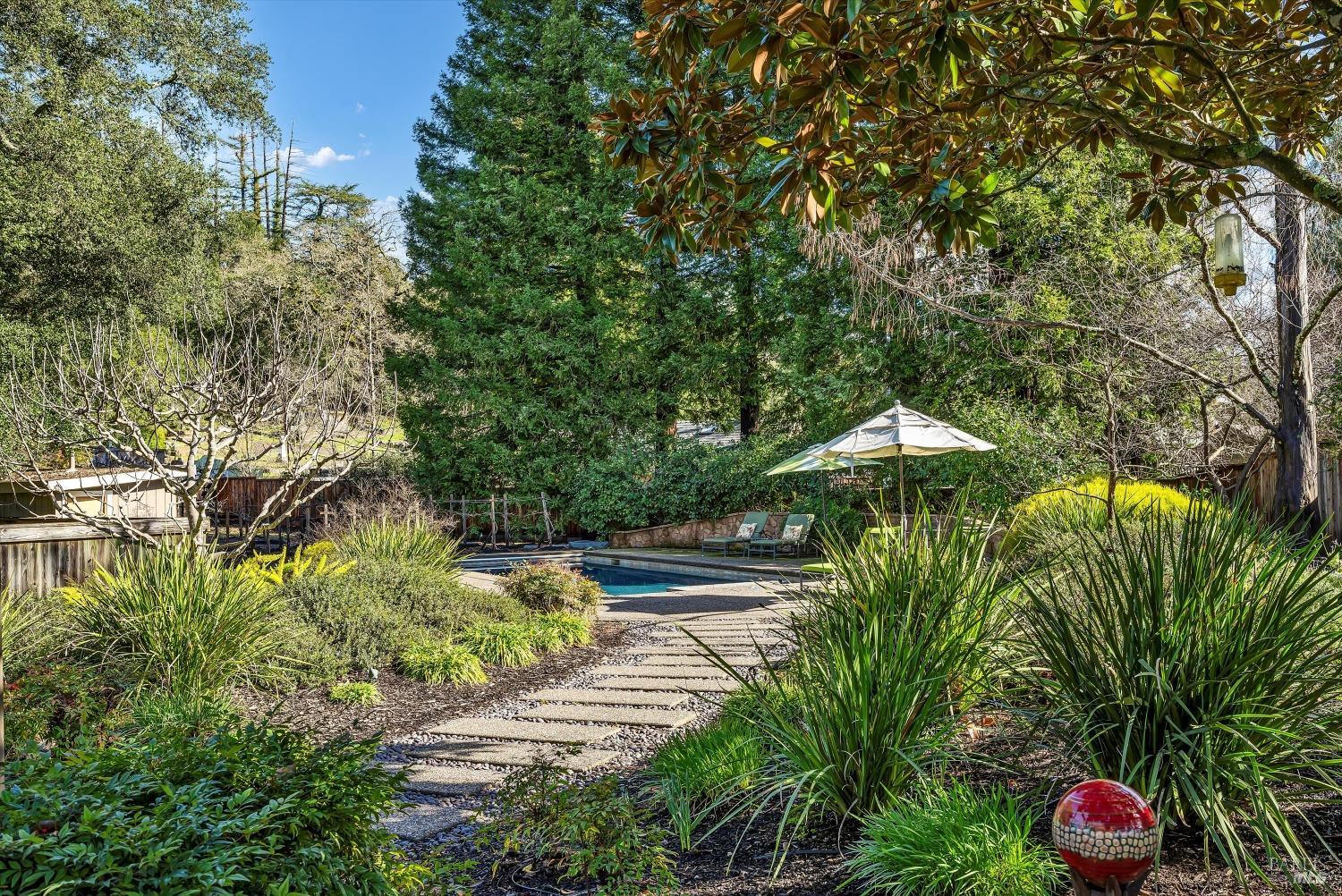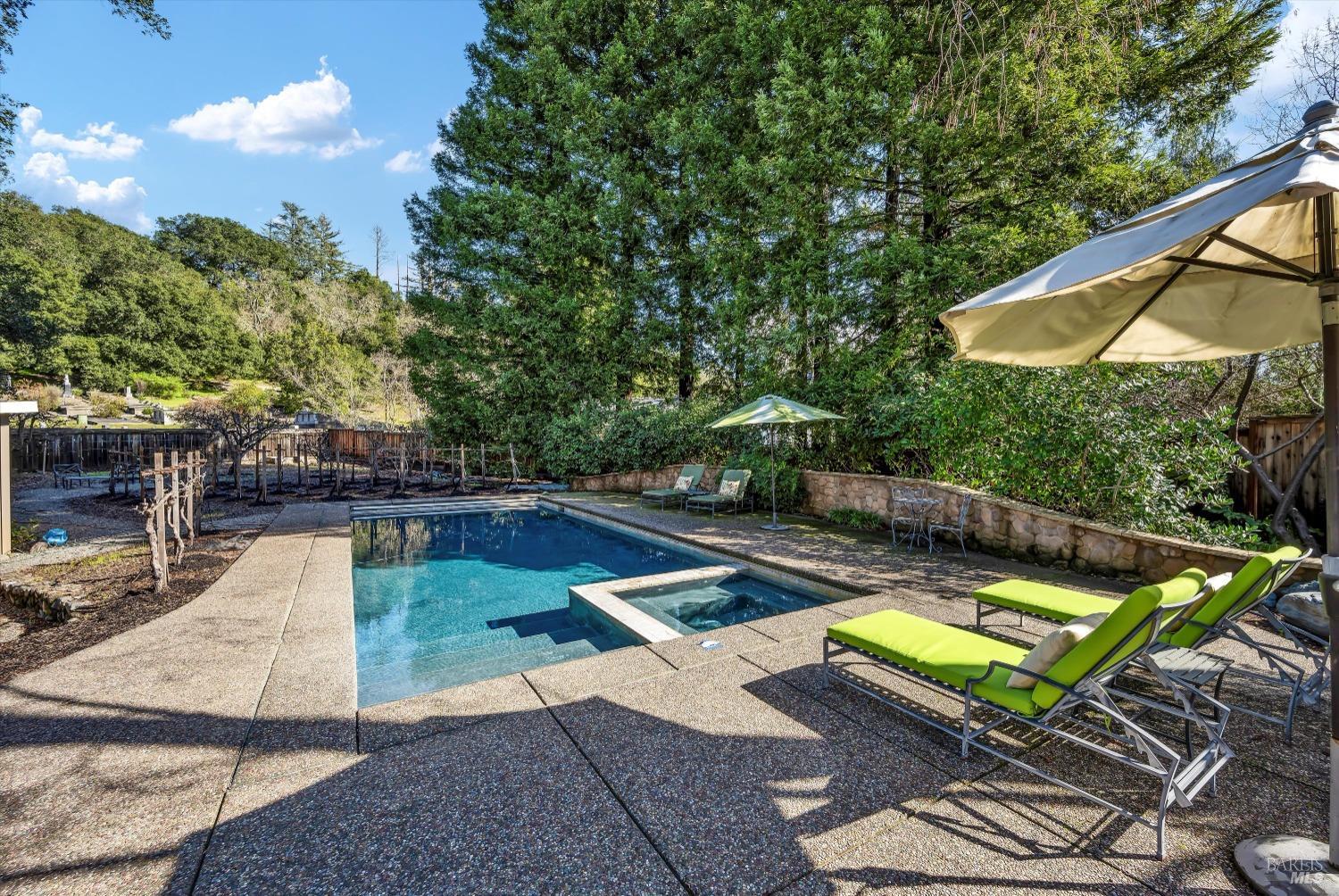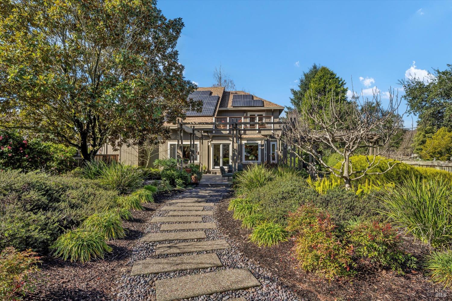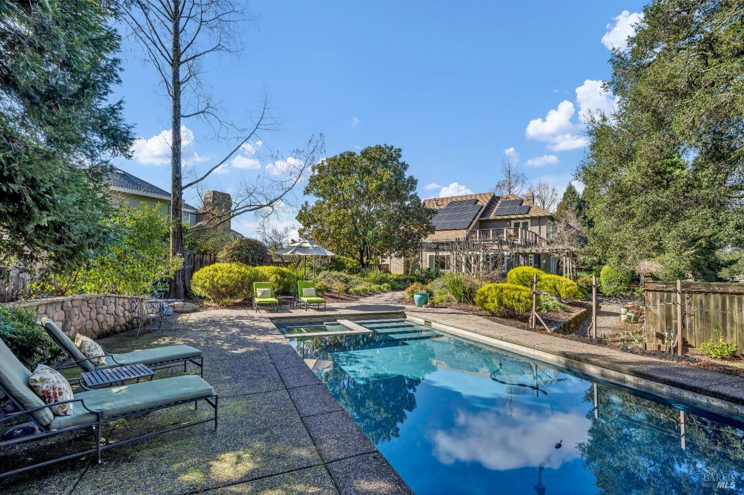 Welcome to Healdsburg Greens, 8 blocks from the Plaza. This exquisite home is nestled on a serene .48 acre in a quiet cul-de-sac, minutes from downtown. Meticulously crafted details include custom woodwork, elegant light fixtures, & breathtaking landscaping. The chef's kitchen features high-end Jenn-Air appliances, a buffet counter, & an oversized island w/ cherrywood cabinetry & Cambria countertops. Enjoy a temp-controlled wine cellar & seamless outdoor access through multiple French doors. Custom fixtures & cherrywood built-ins accentuate the gas fireplaces in the living and family rooms. A main-level ensuite offers direct access to the west yard. Upstairs, the primary suite includes a sitting area, rooftop balcony & gym space. The luxurious bath has dual sinks, a soaking tub, & walk-in closet. Two additional bedrooms enjoy southern light, complemented by a full bath & laundry room. The backyard is a paradise w/ tiered patios, pergolas & diverse landscaping. An in ground pool & spa are nestled among a zinfandel hobby vineyard, fruit trees, & redwoods. Additional features include a 3-car garage, new windows, solar panels, water storage tanks, & pedestrian gate access to public land. This property offers the perfect blend of proximity & privacy, epitomizing Wine Country living.