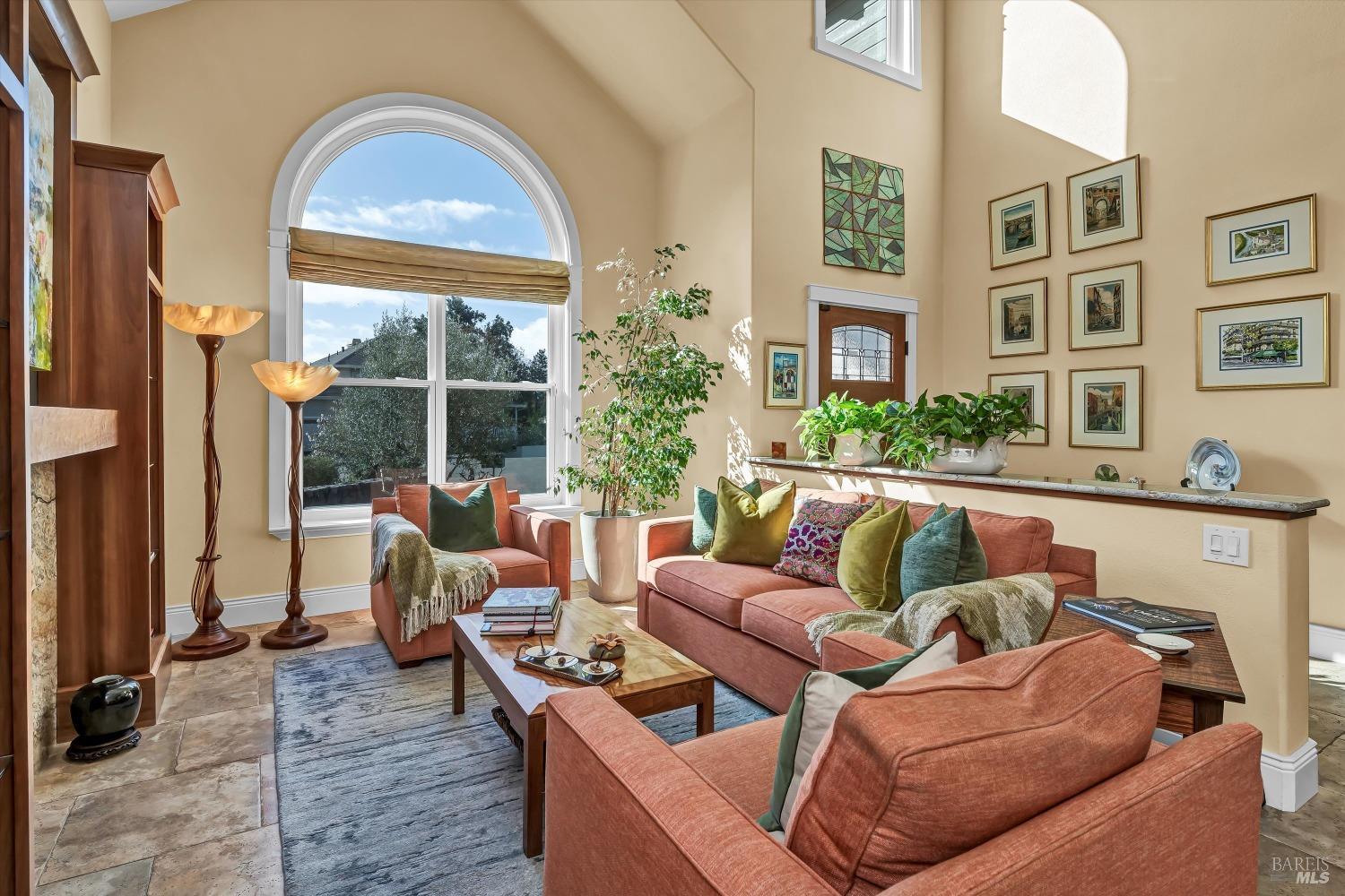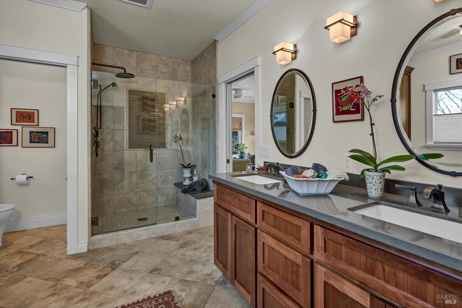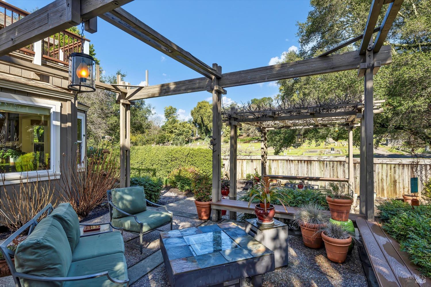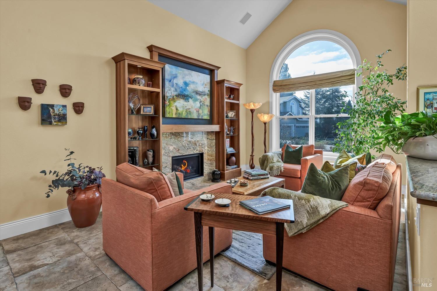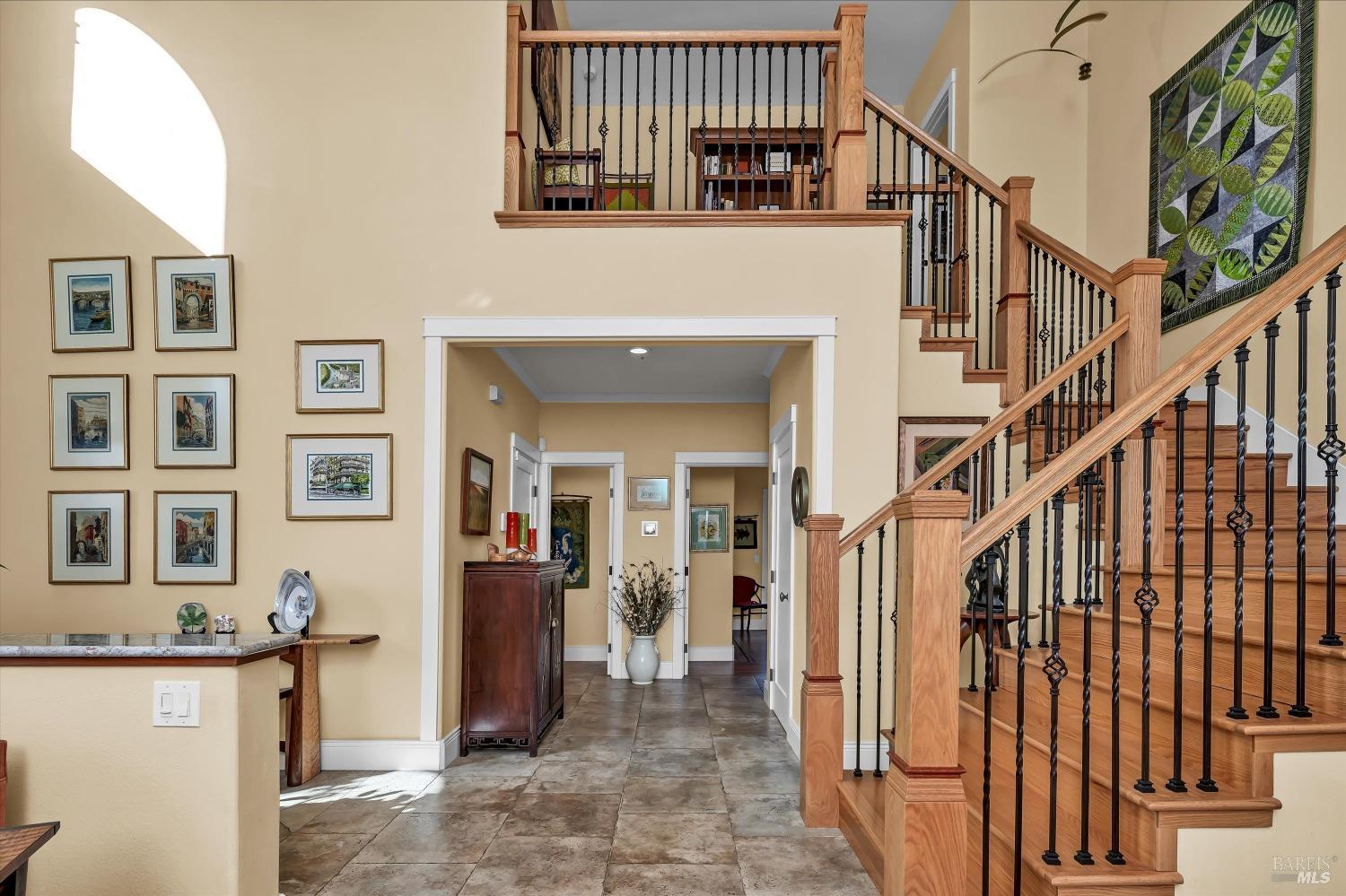 Welcome to Healdsburg Greens, 8 blocks from the Plaza. This exquisite home is nestled on a serene .48 acre in a quiet cul-de-sac, minutes from downtown. Meticulously crafted details include custom woodwork, elegant light fixtures, & breathtaking landscaping. The chef's kitchen features high-end Jenn-Air appliances, a buffet counter, & an oversized island w/ cherrywood cabinetry & Cambria countertops. Enjoy a temp-controlled wine cellar & seamless outdoor access through multiple French doors. Custom fixtures & cherrywood built-ins accentuate the gas fireplaces in the living and family rooms. A main-level ensuite offers direct access to the west yard. Upstairs, the primary suite includes a sitting area, rooftop balcony & gym space. The luxurious bath has dual sinks, a soaking tub, & walk-in closet. Two additional bedrooms enjoy southern light, complemented by a full bath & laundry room. The backyard is a paradise w/ tiered patios, pergolas & diverse landscaping. An in ground pool & spa are nestled among a zinfandel hobby vineyard, fruit trees, & redwoods. Additional features include a 3-car garage, new windows, solar panels, water storage tanks, & pedestrian gate access to public land. This property offers the perfect blend of proximity & privacy, epitomizing Wine Country living.