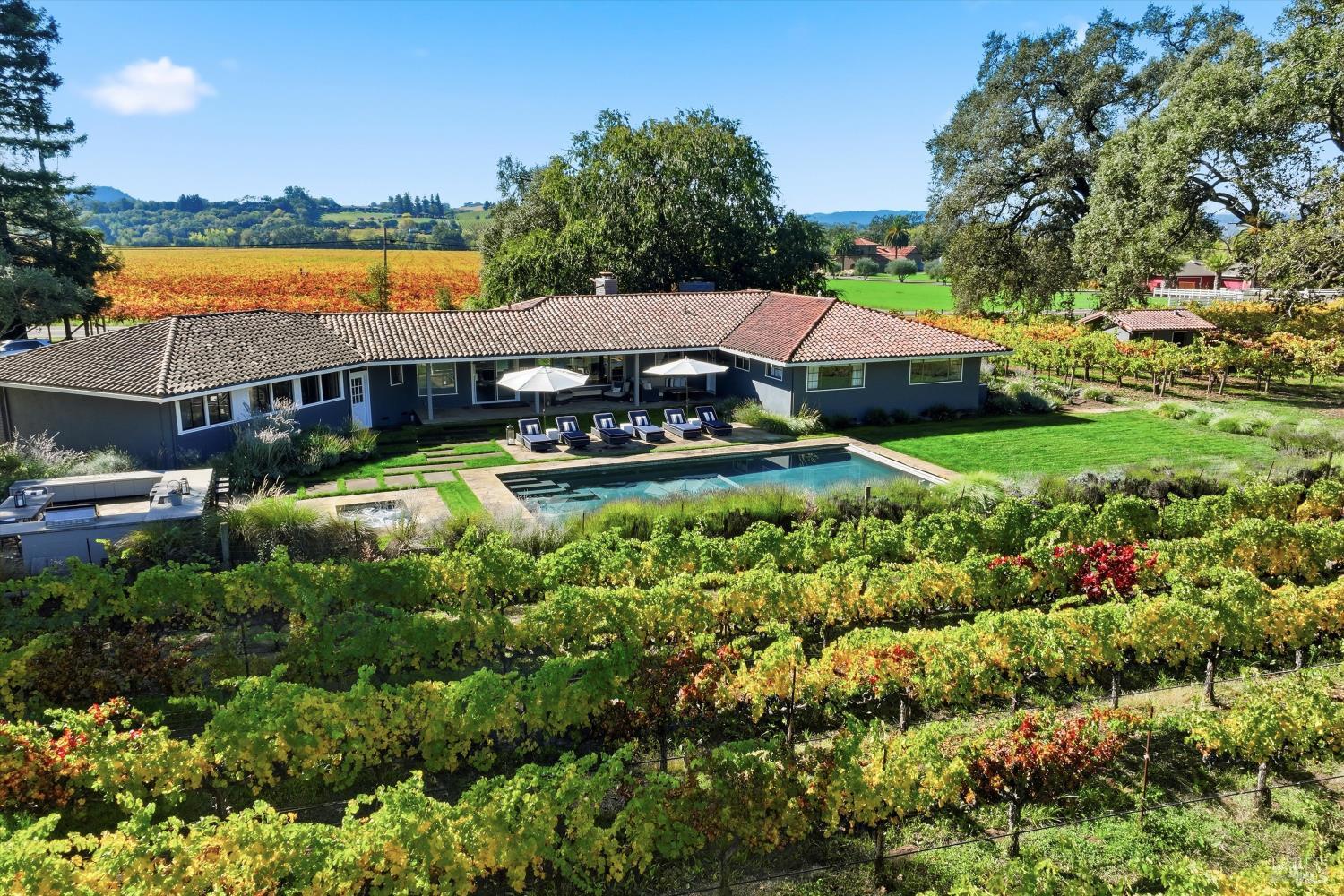 Welcome to beautiful Alexander Valley! This sprawling single-level mid-century modern home is located 13 short minutes from the HBG plaza. Drive in through your private gate to a flat 3 acres, ideally situated among vineyards with incredible 360-degree views. A Wine Country entertainer's dream! Enjoy warm Sonoma County days, lounging by the pool, and preparing a feast in your outdoor kitchen. A 300+ year old heritage oak tree sits at the north end of the property, creating a unique space for ceremonies and other special events. As the weather starts to cool, you can soak in your in-ground spa, gather around the fire pit, or enjoy a movie on your covered outdoor patio under the infrared heaters. The fun can continue in your garage rec room, with a built-in bar, lounge area, shuffleboard, ping pong, and more! Step inside your renovated mid-century modern home. The family room and kitchen sit in the heart of the home with stunning eastern views of expansive vineyards and the Mayacama mountain range. The living room, dining room, and bedrooms extend over the north wing of the home. The south wing of the home has a private entrance, a full bath, and a large open additional room with front and backyard access. This is a perfect space for guest quarters or rec room/pool house lounge. An oversized laundry/mud room, primary bath, indoor-outdoor shower, and two gas fireplaces are additional perks to this already dialed-in home. Perfect for the hobby wine maker, the property includes a 2-acre Chardonnay and a 1/2-acre Cabernet Sauvignon Vineyard. (Currently cared for and leased by a local winery). Completely fenced with a private entry gate and parking for up to 15+ cars, this property is great as a full-time residence with Alexander Valley Elementary School just two minutes away. As well as for Wine Country weekenders with close proximity to renowned wineries of Silver Oak, Medlock Ames, and Robert Young. All of this, and less than 15 minutes to the happening downtown plaza & everything else Healdsburg has to offer.